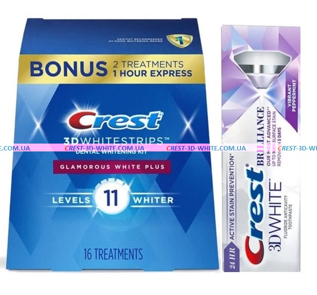 Запечатанная упаковки: 16 стикеров (32 полоски) + отбеливающая паста Crest 3D White Brilliance 110г