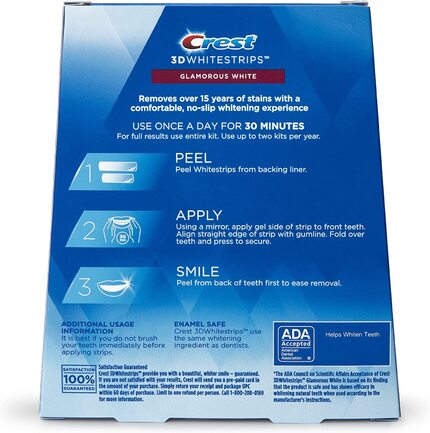 Используя полоски Crest 3D White Whitestrips Glamorous White, вы обеспечите себе отбеливание зубов профессионального уровня всего за 14 дней, а результат, при ежедневной гигиене полости рта, продлится более 12 месяцев. Используйте в течение 30 минут один раз в день для достижения белоснежной улыбки.