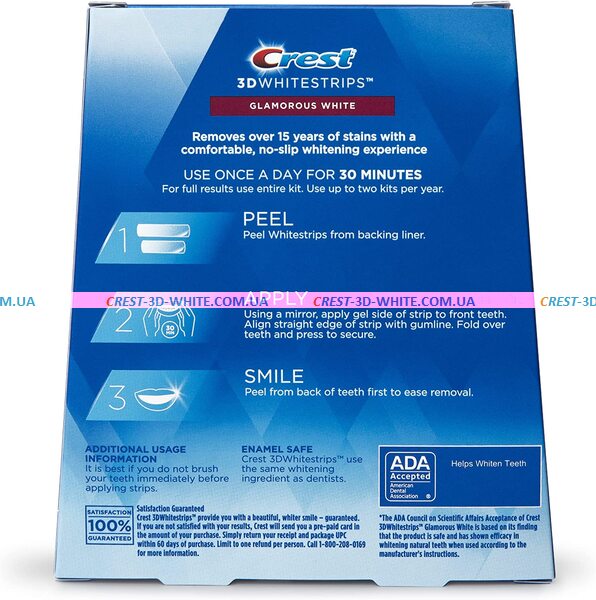-Полоски Crest Glamorous White используются в течение 30 минут один раз в день, чтобы обеспечить самое эффективное отбеливание.