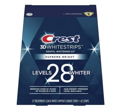 Отбеливающие полоски Crest 3D White Whitestrips Supreme FlexFit. Это последняя разработка американских ученых в области профессионального отбеливания зубов и ухода за полостью рта. Эти полоски вместили в себя все самые последние технологии в отбеливании зубов. Теперь отбеливание стало ещё эффективнее и при этом более комфортным. Новая формула отбеливающих полосок Supreme FlexFit позволяет проходить курс отбеливания практически без дискомфорта и повышения чувствительности зубов. Технология "No Slip" и новая форма самих полосок помогает им ещё крепче держаться на зубах и не соскальзывать. А инновационная технология "FlexFit" позволяет полоскам растягиваться и принимать любую форму, основываясь на индивидуальных особенностях зубов каждого человека. Эта технология делает полоски ещё длиннее, что позволяет охватить больше поверхности для отбеливания.Теперь Вам достаточно использовать отбеливающие полоски всего 21 день для достижения высокого, профессионального уровня отбеливания зубов. Результат после прохождения курса отбеливания полосками Supreme FlexFit приравнивается к результату процедуры лазерного отбеливания зубов!